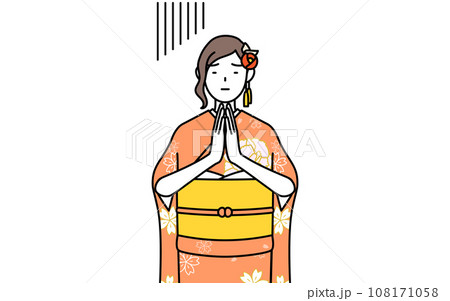 体の前で手を合わせて謝る振袖姿の女性、お正月の初詣や成人式、卒業式や結婚式などで
