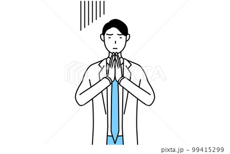 体の前で手を合わせて謝る聴診器をかけた白衣の男性医師、シニア・中高年のベテラン医師