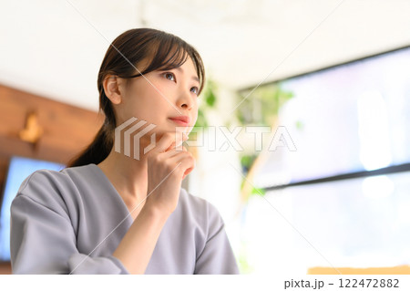 憂鬱そうな表情でテーブルに肘をつく若い女性