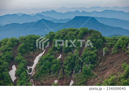 谷川岳・西黒尾根の残雪と巻機山の眺め