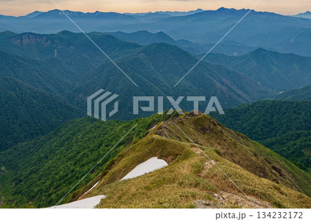 新緑の谷川岳・西黒尾根の登りから見る朝の上州武尊山