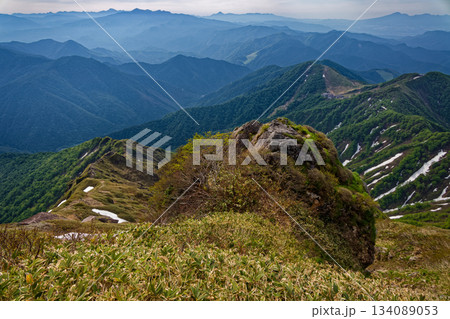 西黒尾根から見る残雪の谷川岳山頂と朝日岳・巻機山の眺め