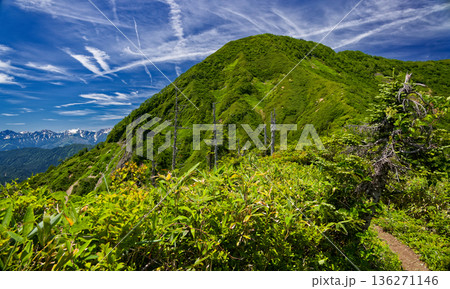 戸隠山からの登山道から見る高妻山山頂と北アルプス・白馬岳・後立山連峰
