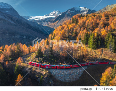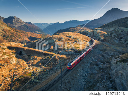 Aerial view of modern red train, alpine mountains, orange meadows