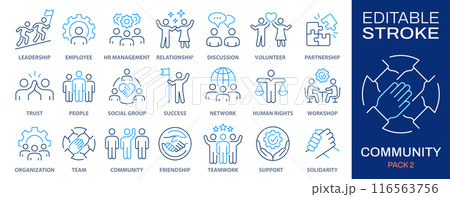 Community icon set. Collection of people, handshake, team, partnership and more. Vector illustration. Editable stroke.