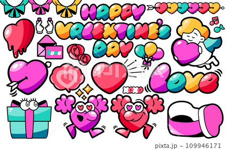 ハートやプレゼント・リボンのバレンタインデーがテーマのカラフルポップでかわいいイラストセット