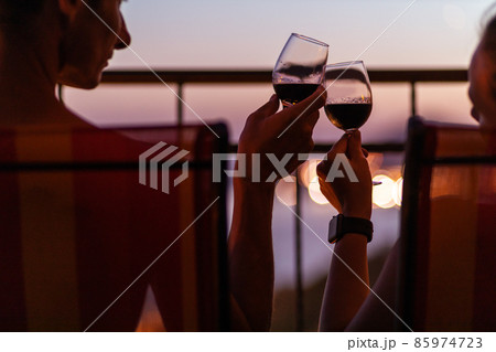 Silhouette of couple drinking wine at the sea view terrace in the evening. Valentine day image