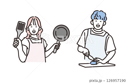 シンプル イラスト 料理をする男性と女性 人物セット