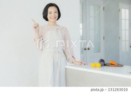 キッチンで指差しする女性