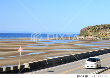国東半島の恋叶ロード ドライブイメージ(国道213号線 豊後高田 真玉海岸と白いエコカー)