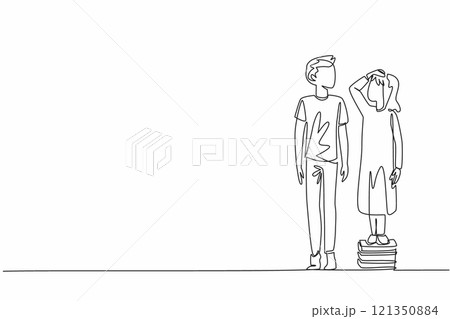 Continuous one line drawing older brother stands on tiptoe while younger sister stands on a pile of books. Want to be on same level. National Siblings Day. Single line draw design vector illustration