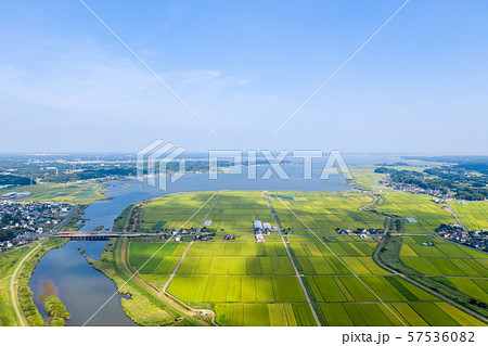 水田が広がる茨城県の恋瀬川河口と霞ヶ浦を俯瞰撮影