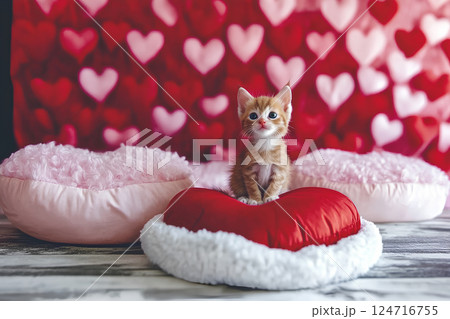 A cute small kitten sitting comfortably on a heart-shaped pillow, exuding warmth and charm in a cozy and affectionate setting