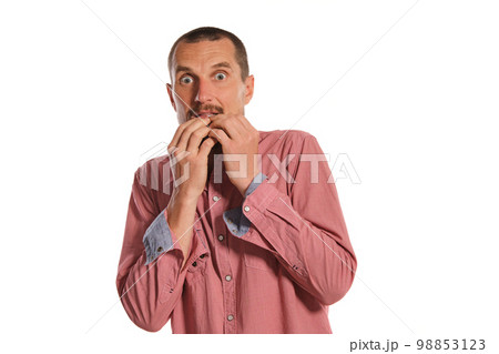 Afraid man in light studio. White background.