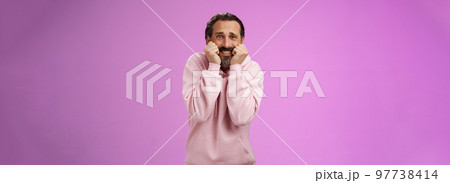 Scared insecure silly adult bearded man grey hair in pink hoodie press palms mouth bite fingers clench teeth shocked frightened widen eyes terrified standing stupor horrified, purple background