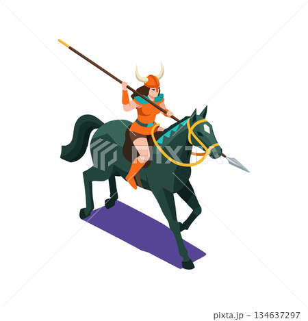 Viking warrior woman riding dark horse with spear in battle-ready pose vector illustration