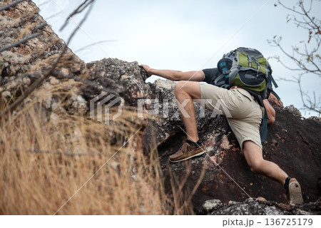 Hiker man climbing natural rocky wall with tropical valley on the background.