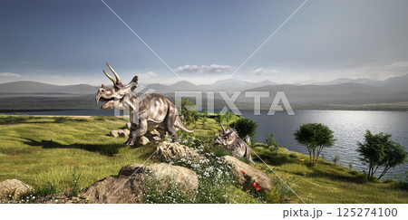Diceratops dinosaurs in mountain - 3D render