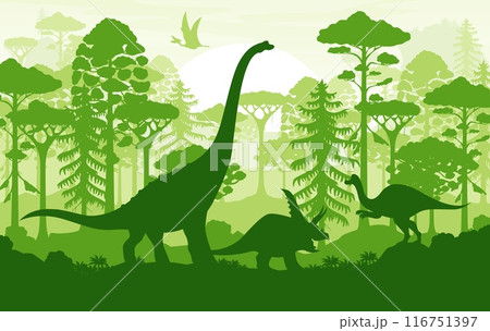 Prehistoric landscape, dinosaurs silhouettes in tropical jungle forest. Vector shadow scene of Jurassic era with dino animals and ancient flora with trees and ferns under a sunset sun in green colors