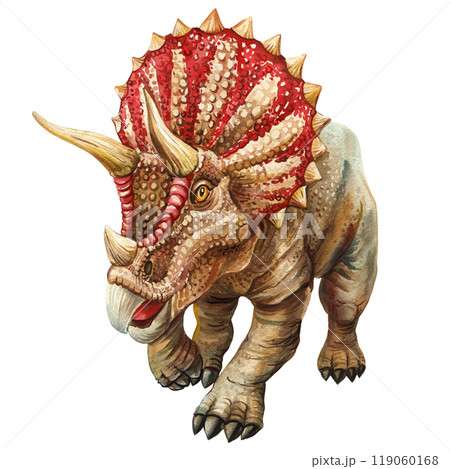 Dinosaurs watercolor prehistoric giant. Detailed scales, horns, and spikes. Triceratops on isolated white background
