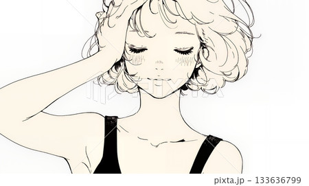 気恥ずかしそうに頭をかき、ごまかすような仕草を見せる若い女性(シンプルな色使い)