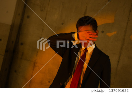 顔を覆うスーツ男性