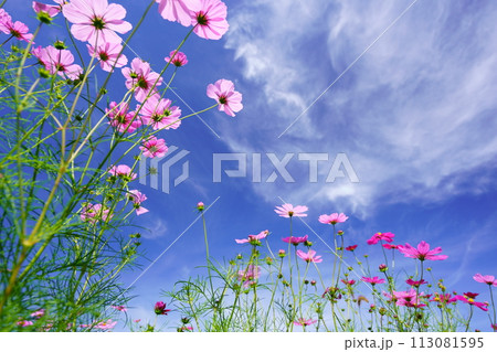 早朝の秋空・フレッシュなコスモスをローアングルで見上げる