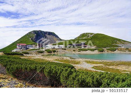 岐阜県(長野県)乗鞍岳のバスターミナル付近の魔王岳登山口から恵比寿岳の斜面と亀ヶ池を見る