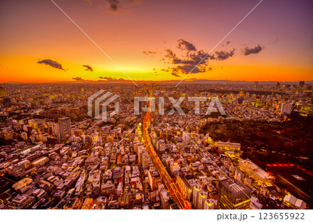 日本の東京都市景観 富士山が見える珍景・新風景。渋谷のビル群や電車などを望む。アクシュ、男体山