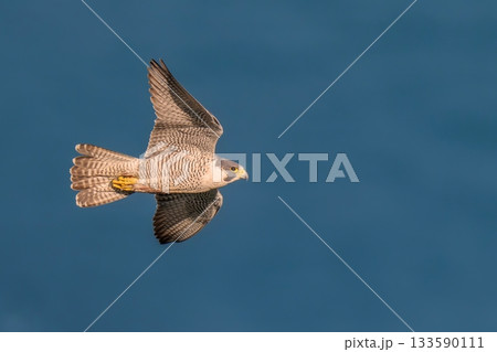 日本海をバックに朝日を浴びながら悠然と飛ぶハヤブサ成鳥