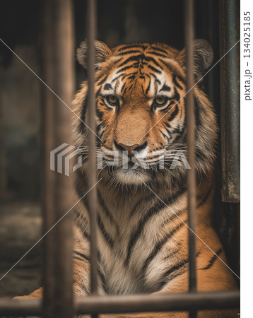 Tiger peers through bars in a zoo enclosure. The tiger gazes calmly at the viewer in a dim cage.