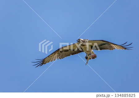 青空バックに大きな獲物をつかんで悠然と飛ぶミサゴ