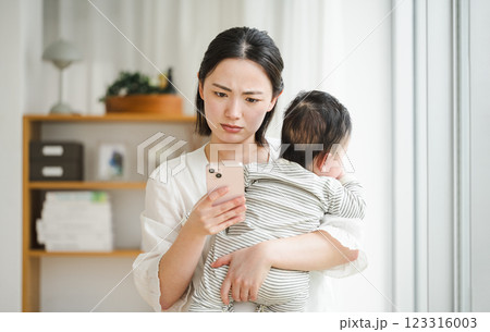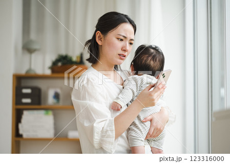赤ちゃんについて考えるママ(育児・子育て・家族・ファミリー).