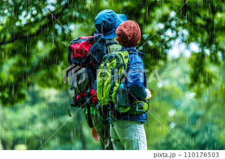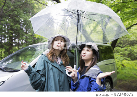 キャンプ場に到着して雨が降っていてがっかりする女性友達 アウトドアイメージ