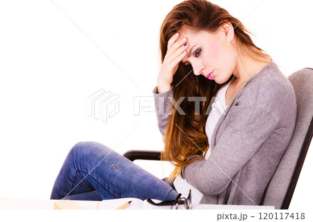 A girl with a solemn expression rests her head in her hand, seated in a minimalistic space. This photo represents feelings of loneliness, worry, or personal reflection.