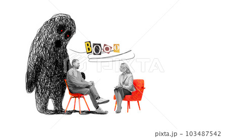 Man visiting psychologist, asking for help, suffering from hidden fears, depression and sadness. Contemporary art collage.