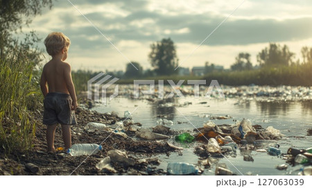 A Young Boy Stands by a River Polluted with Plastic Waste