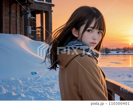 AI画像 雪景色の夕暮れに寂しそうに振り返る若い女性