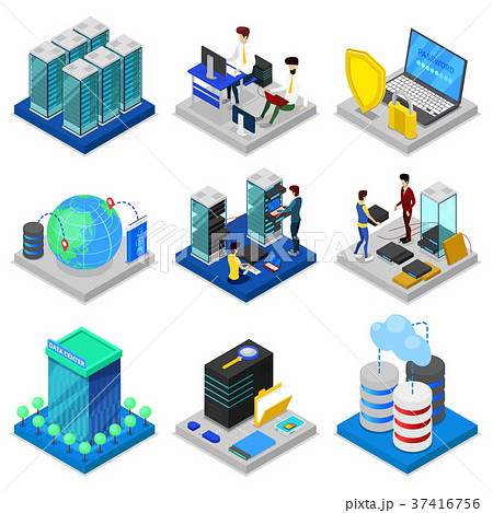 Data center isometric icon set, vector isolated illustration. Computer network equipment, server racks and staff.