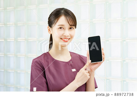 スマートフォンの画面を見せるユニフォーム姿の女性