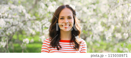 Lovely happy smiling young woman in spring blooming garden with white flowers on the trees in park
