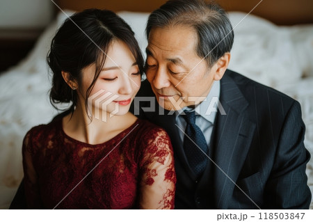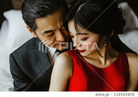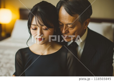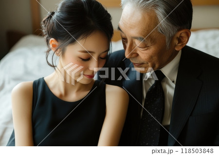 ドレスを着た愛人風の美女とスーツを着たシニア男性(パパ活・P活・不倫・密会・売春)