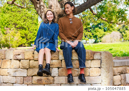 レンガの壁に座る日本人カップル