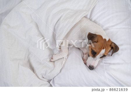 Jack Russell Terrier dog lies in bed under the covers. The pet sleeps in the bedroom.