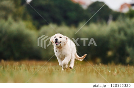 Happy dog, joyful pet lying outdoors on a summer sunny day