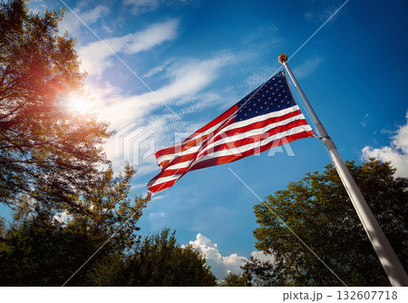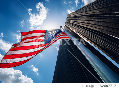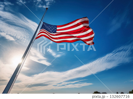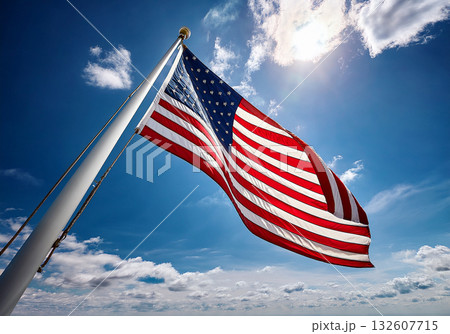 青空に舞う星条旗:希望、自由、そして力強さを伝えるドラマチックなアングル