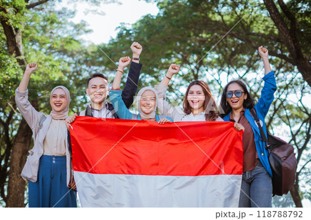 Closeup view of the Indonesian national flag waving against a sky background. Celebrate Indonesia Independence Day. Concept of Kemerdekaan Indonesia