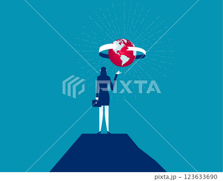Businesswoman holding world at the top of mountain. Business vector concept