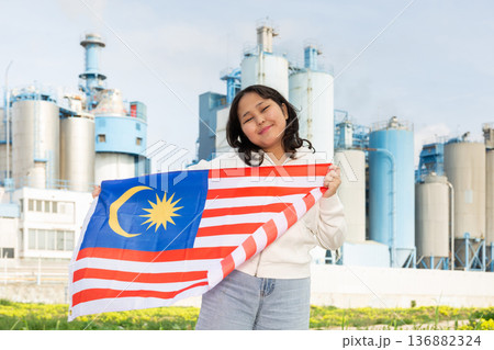 Happy young woman with flag of Malaysia against background of factory