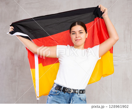 Calm girl stands with flag of Germany.Isolated on gray background